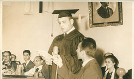 Orador de turma discursando na formatura de 1964. Ao fundo, entre professores de autoridades encontram-se a Professora Dorinha, o Reitor Edson Potsch e o Secretário de Agricultura Roberto Resende.