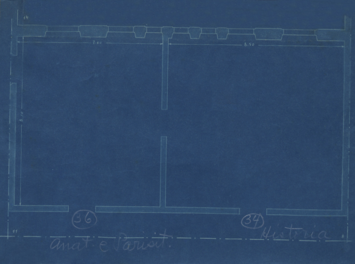 Rascunho da planta baixa das salas 36 (Anatomia e Parasitologia) e 34 (História do Brasil e Geografia) do Prédio Principal.